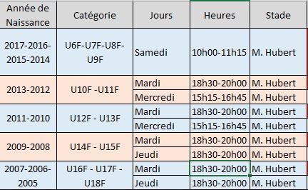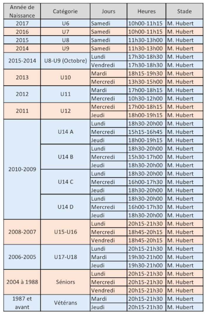 Voici par catégorie les horaires d’entrainement :